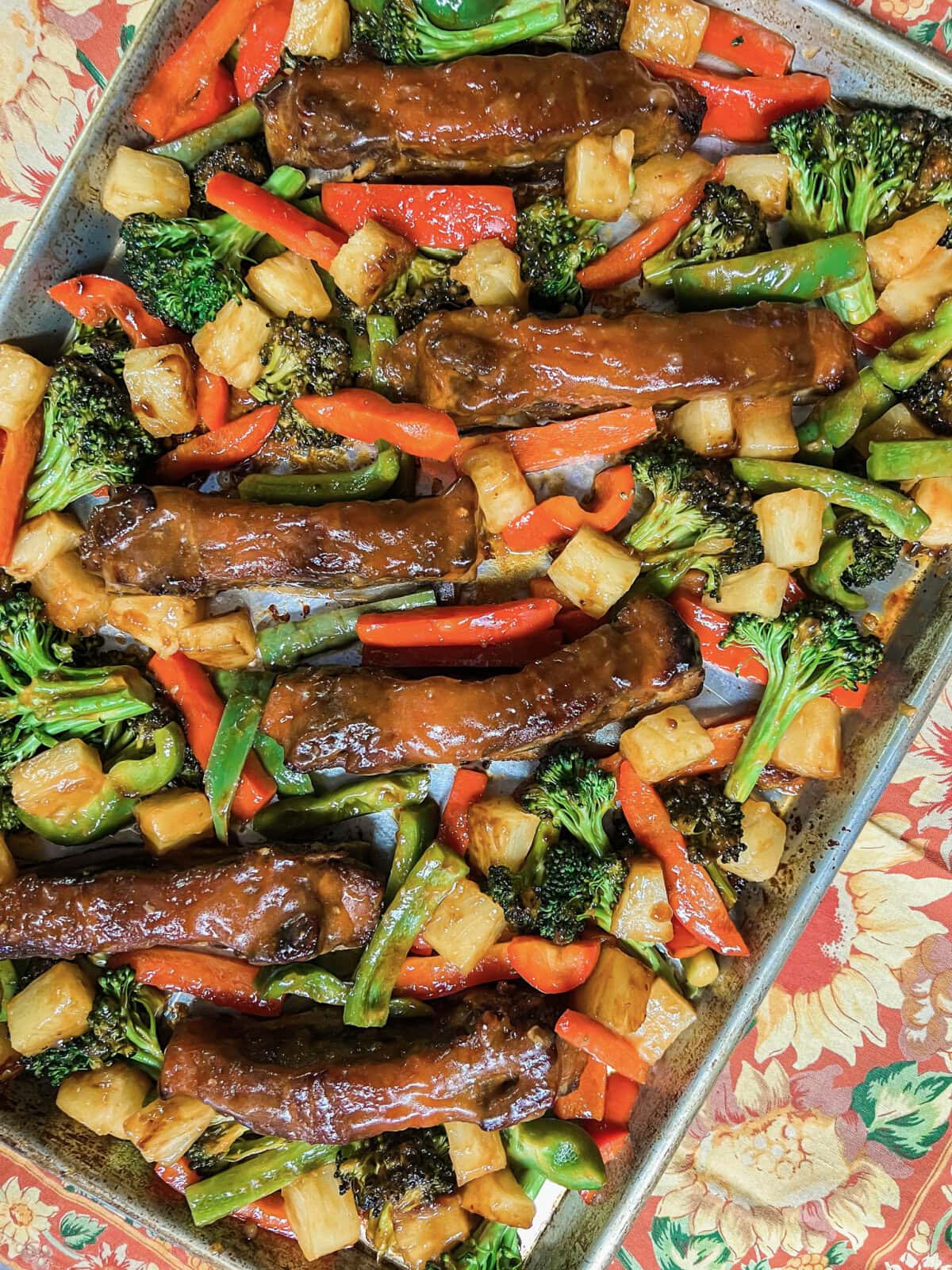 Sweet and Sour Boneless Pork Ribs is an easy oven-baked sheet pan recipe with country-style pork ribs that turn out tender and juicy every time. It makes a quick weeknight meal for the family. As a mom, I also love that this sheet pan meal includes lots of veggies.