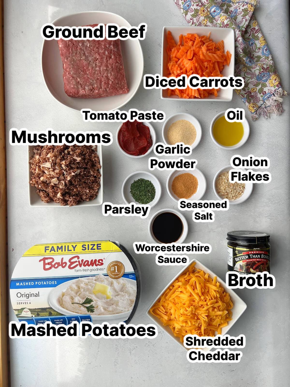 - ๐ฅฃ Main Ingredients: Ground beef, minced mushrooms, tomato paste, spices, mashed potatoes and cheddar cheese