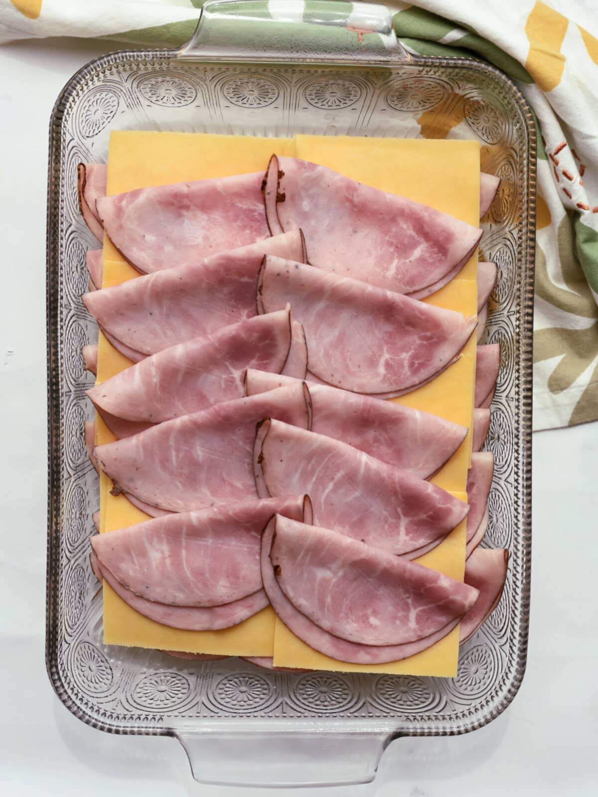 Step 3: Layer half of the ham on top of the rolls, piling it up slightly. Top the ham with the sliced or shredded Gouda cheese.