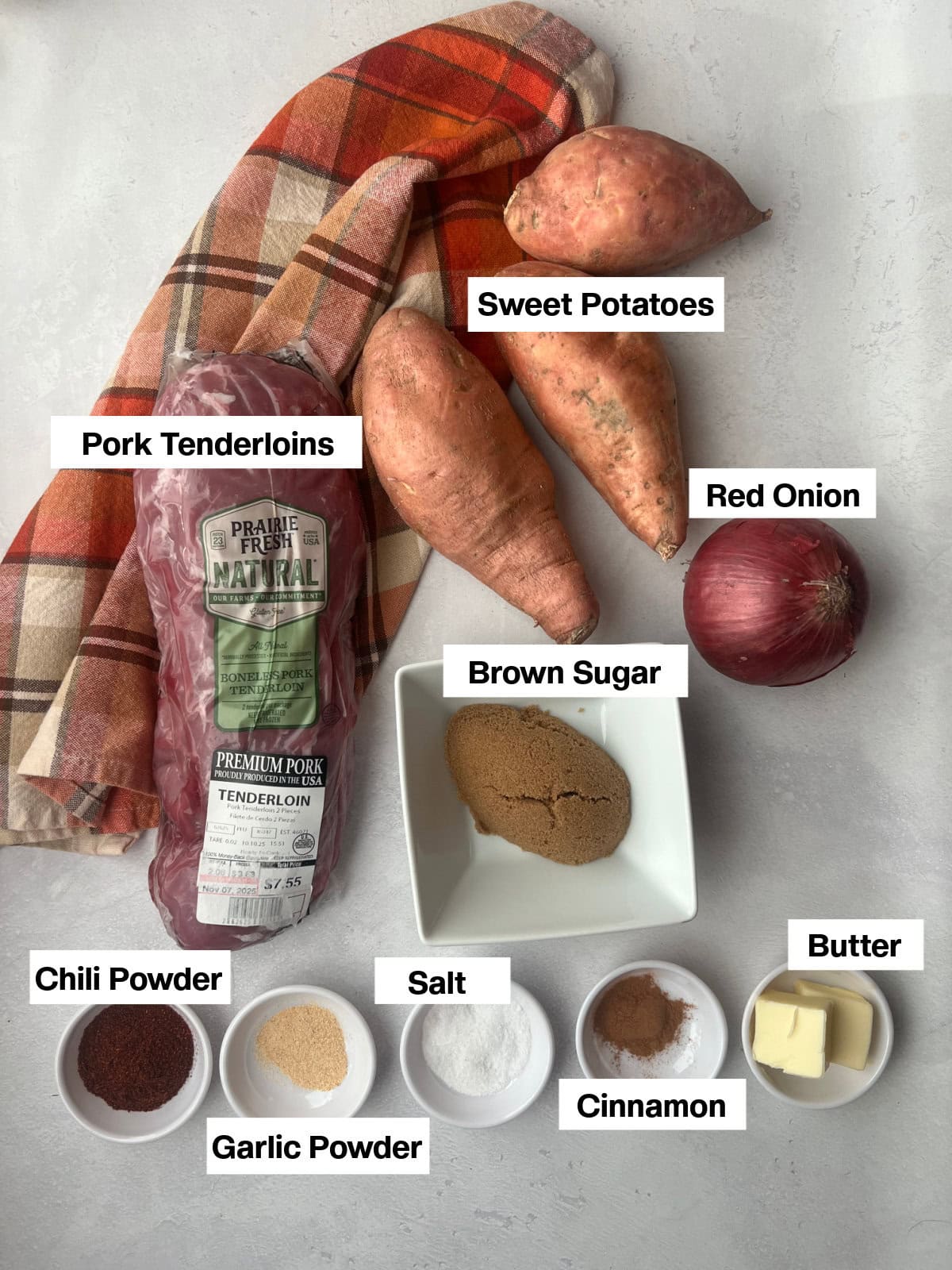 Pork tenderloins with sweet potatoes and red onions are seasoned with brown sugar, cinnamon, and chili powder. Everything is roasted together on a sheet pan making a juicy Pork Tenderloin and Sweet Potato Sheet Pan Dinner.