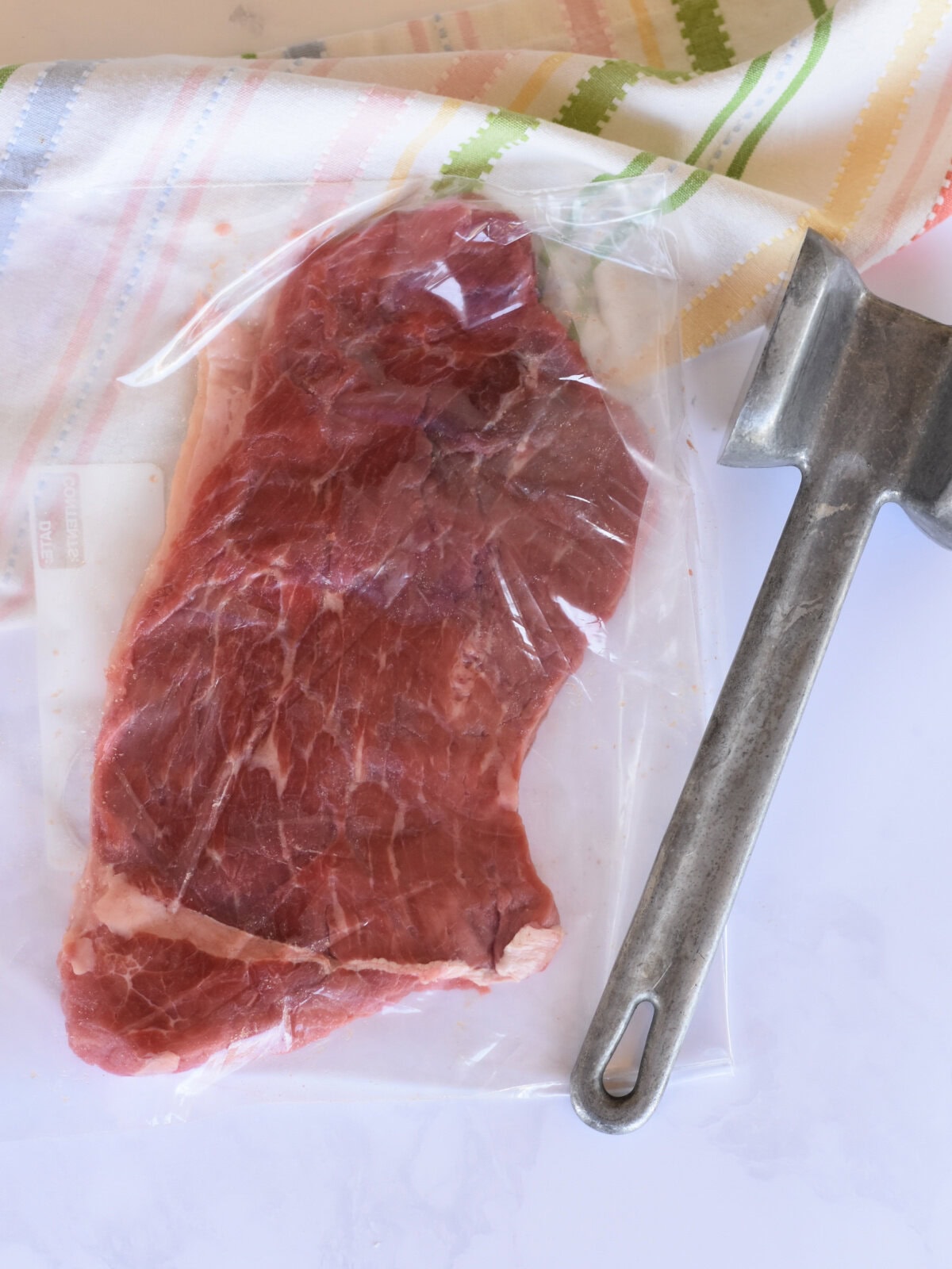 Step 1: Place the round steak into a gallon freezer bag, pressing out the air. Seal the bag. Make sure to use a gallon FREEZER bag. It is thicker and more sturdy (than just a plastic gallon bag).