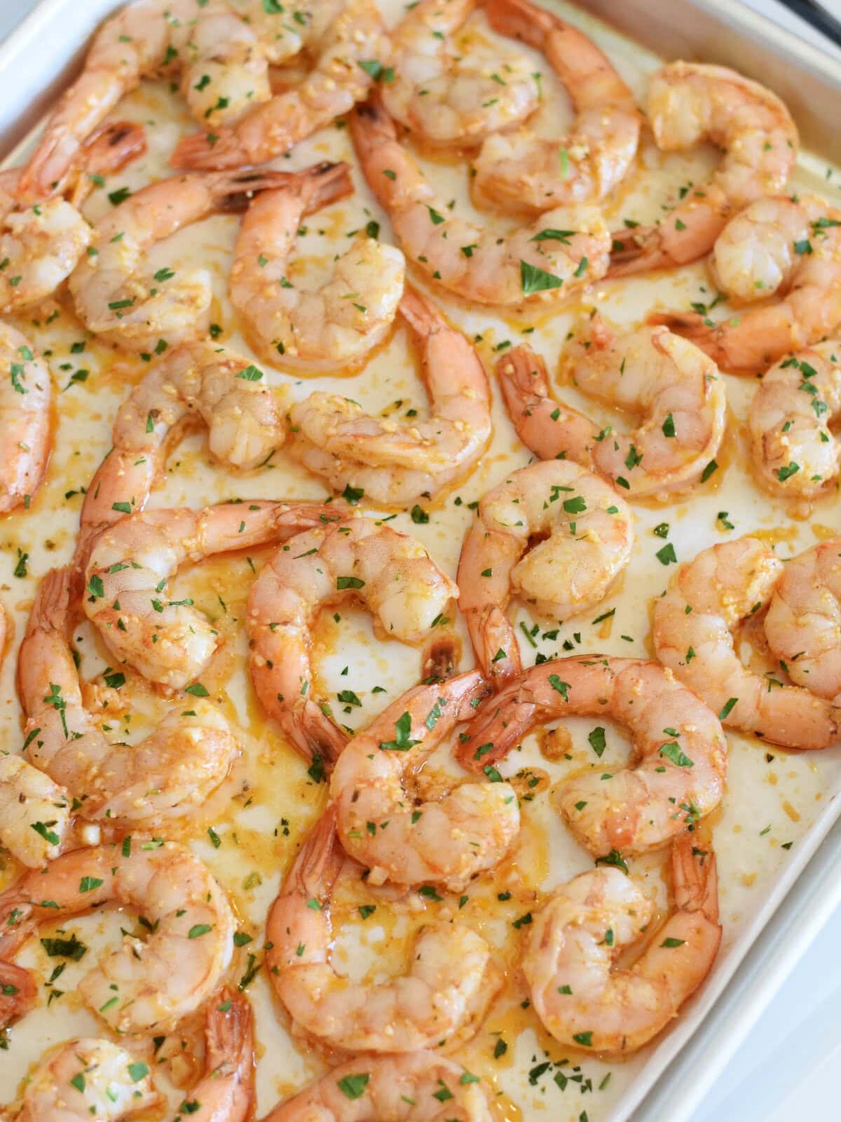 This easy shrimp recipe easily doubles and if you do so, be sure use two baking sheets for cooking the shrimp so they are placed in a single layer and have lots of space around each piece of shrim so the heat can circulate well.