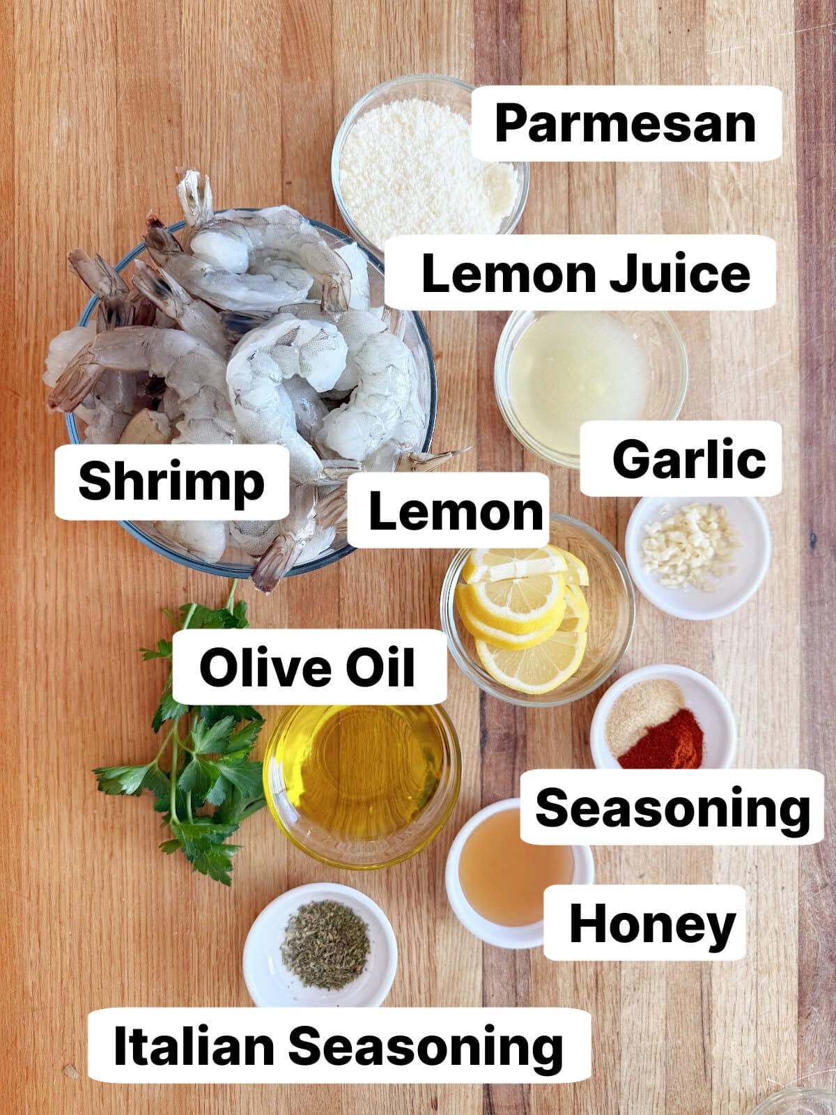 Step 2: Place the raw shrimp into a large mixing bowl. In a dressing cruet or a glass jar with a tight-fitting lid, whisk together olive oil, lemon zest, lemon juice, crushed garlic, honey, smoked paprika, onion powder, Italian seasoning, and Parmesan; shake well to combine.